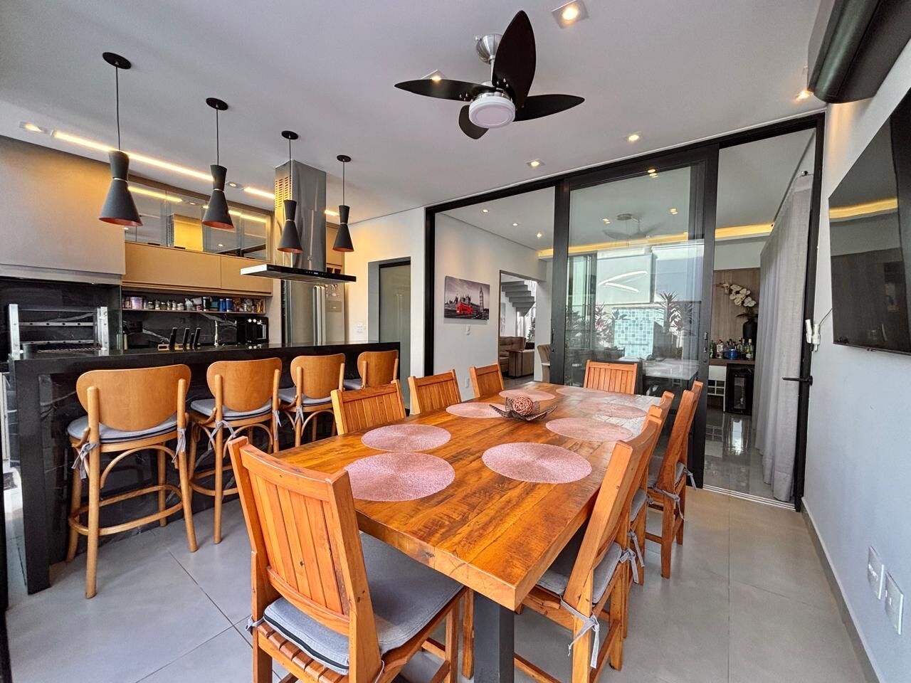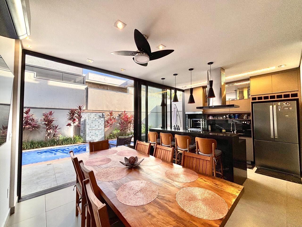 • Sala com pé direito duplo, ar-condicionado e integração perfeita — um ambiente que impressiona logo na entrada.